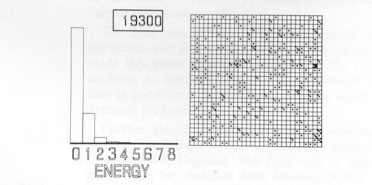 The computer game uses a board 30 x 30. The starting point for the first game is with one quantum of energy on each atom. The film makes the initial moves very slowly so that the student can satisfy himself that the film is playing the same game. Later the speed of playing is accelerated, and a run of 20,000 moves is played. The initial and final frames of this sequence might be as in Figures 5 and 6. Taking the average of the last 10,000 moves, it can be seen that Nn/Nn+ 1 = 2, where Nn is the number of atoms with n quanta of energy.