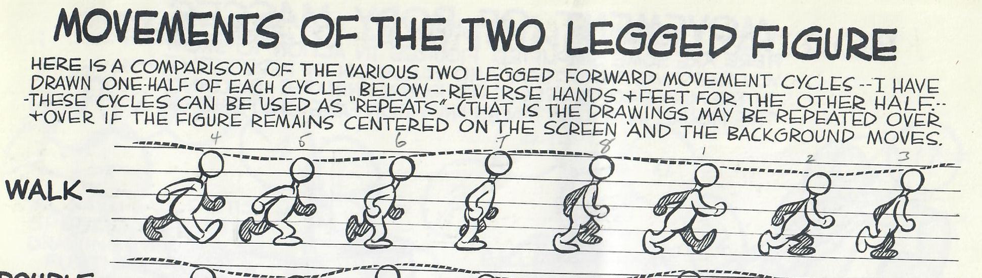 Below is the man walking key frames from Preston Blair. The first animation shows the walk running at 10 evenly spaced frames. The second show how the same walk can produce alternative walks by varying the number of inbetween frames between the key frames.