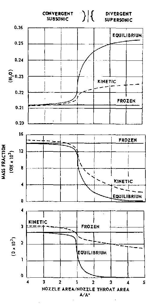 The expansion of hydrogen air combustion products was investigated by Sarli et al (38) since the degree of recombination at the exit of SCRAM jet nozzle will have an important influence upon the thrust. Equilibrium, frozen and nonequilibrium solutions were compared, typical results being shown in Fig. 1. Westenborg and Farvin (41) carried out extensive investigations of nonequilibrium expansions involving the species combinations H2, H22O, CO, CO2, H, OH and H2, H2O, O2, H, OH, O. On the basis of the exact computations various approximation schemes sometimes used in nozzle calculations were assessed, and the effects of changes in some of the critical rate constants were examined. This typical computer experiment also made it possible to assess the importance of the various reactions occurring in the nozzle. A similar comparison between approximate nonequilibrium nozzle flow theories and exact computations was carried out by Wilde (42) for the chemical systems UDM H/N2H4-N2O4 and CH2-O2. With increasing length nonequilibrium losses in a rocket or ram jet nozzle should decrease; however, frictional losses will increase. On the basis of numerical calculations (or a computer experiment) Sarli et a1 (43) established that the increase in friction will generally outweigh any effects of increased recombination.