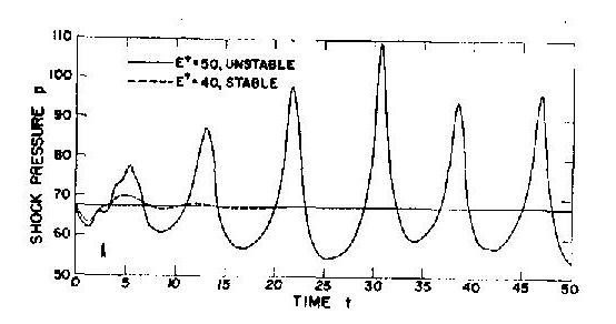 Computer experiments have yielded some remarkable results in the study of detonations in gases and solids; therefore, even though detonation theory may not have direct application to chemical propulsion it is felt that the interesting nature of these experiments warrants their discussion below. The experiments of White (64) and others showing that self supported detonations tend to be turbulent has led to studies of the stability of detonations such as that of Erpenbeck (65). In order to test this theory Fickett and Wood (68) used a computer experiment to study the initiation of a detonation due to the motion of a piston through a combustible gas. The numerical solution of the time dependent one dimensional reactive flow equations was obtained using the method of characteristics and treating shock waves as Rankine-Hugoniot discontinuities. Only a single step reaction of the form A-B, with activation energy E was considered. The long time behavior of overdriven detonations was studied for different values of E corresponding to unstable, neutrally stable, and stable regimes in the Erpenbeck theory (65). Typical shock pressure variations corresponding to a stable and an unstable detonation are shown in Fig. 2. The results of this experiment were in good agreement with Erpenbeck's theory, though of course the applicability of one dimensional calculations such as these to real detonations, where transverse waves may be quite important, is subject to question. Numerical computation of two dimensional instabilities is surely a subject for future research. Gilbert and Strehlow (67) studied the initiation of detonations behind reflected shock waves numerically using several models based on different laws of induction time and heat addition. This computer experiment was used to evaluate the ability of various models of the initiation process to represent experimental results.