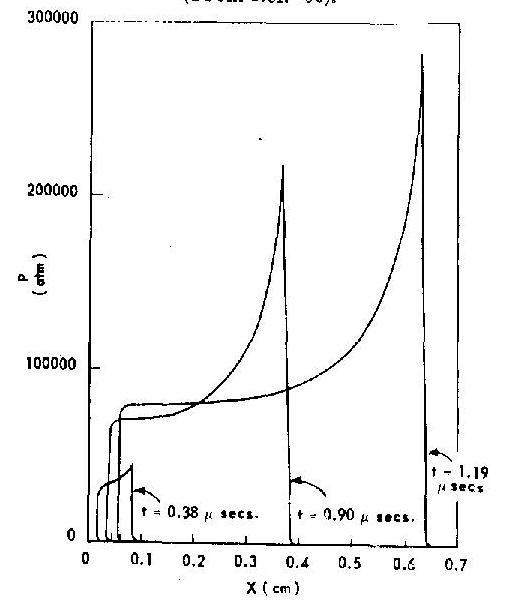 Initiation of detonations in solid explosives due to an incident shock wave was studied numerically by Warner (68). The one dimensional unsteady flow equations were integrated using Lax's finite difference scheme (23). A modified Abel type equation of state and a pressure dependent burning law were used. Incident shock waves of various strengths were considered and were found either to decelerate or to accelerate to form a Chapman-Jouguet detonation. Typical pressure profile development as a function of time is shown in Fig. 3. Warner concluded from his experiment that use of a pressure dependent burning law was important in obtaining an adequate representation of explosive behavior. Shock waves interacting with bubbles or inhomogeneities in explosives give rise to hot spots which, if of sufficient size, can also initiate detonation. Mader (69) used a computer experiment to study both shock and hot spot initiation of detonation in solid explosives. The computations were performed by writing the equations of motion in a Lagrangian finite difference form. The hot spot model which is in part based on the computer experiment of Evans et al (70) on shock-bubble interactions was idealized as a spherically disturbed region with uniform temperature and density. Mader's computations made it possible to follow the complex processes which occur during hot spot initiation in detail. The critical hot spot radii determined by Mader(69) were in remarkable agreement with experimentally determined values. In a more ambitious study Mader (71) used the particle in cell method to simultaneously determine the interaction of a shock with a bubble and an aluminum cylinder in nitromethane and the accompanying initiation of detonation in the explosive. Hot spot initiation was also studied numerically by Friedman (72) in order to determine explosive impact sensitivity.