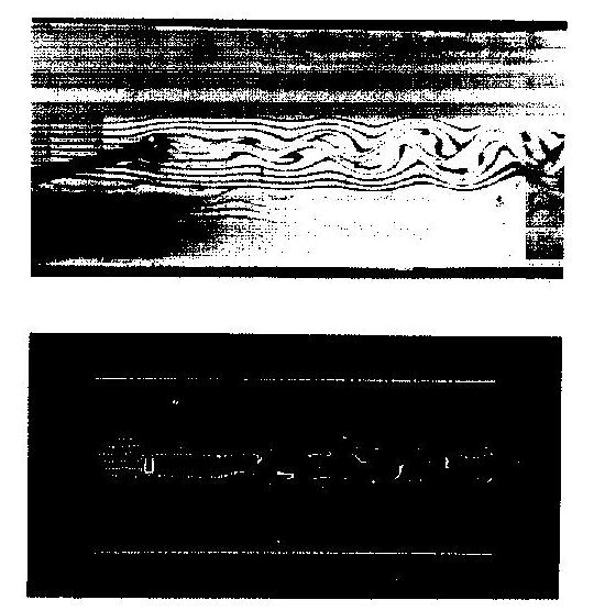 was obtained for the two dimensional viscous flow over a rectangular obstacle. A forward marching procedure was used to solve the vorticity equation for each succeeding time interval, but at each time interval the variation of the Liebmann method described in Section II above was used to iteratively solve the Poisson equation for the stream function. The fact that the computer output was converted directly into graphical form is an extremely important feature of this experiment and others like it, for detailed interpretation of the numerical data produced by such a calculation would be a hopeless task. In Fig. 5, taken from Ref. 80, the experimentally observed dye trails behind a circular cylinder are compared to the computed streaklines behind a flat plate. This amazing picture might perhaps be considered a monument to the computer experiment: The results of the computations were also presented in the form of a movie film showing the detailed development of the vortex street behind a flat plate. By including the heat conduction equation Harlow and Fromm (82) are also able to compute isotherms and the heat transfer from a heated cylinder to the surrounding fluid. Correlation curves of Nusselt versus Reynolds number were obtained from the calculations. A finite difference solution for the motion of a circular disc through an incompressible viscous fluid has been obtained by Michael (83) for low Reynolds numbers. Drag coefficients determined in this computer experiment were in excellent agreement with experimental values. Amsden and Harlow (84) used the Particle in Cell method to study the development of the wake behind the flat base of a projectile moving supersonically through air. Wake experiments, such as those described above coupled with exothermic chemical reactions might shed some interesting light on the behavior of flame holders and might be an interesting subject for future study.
