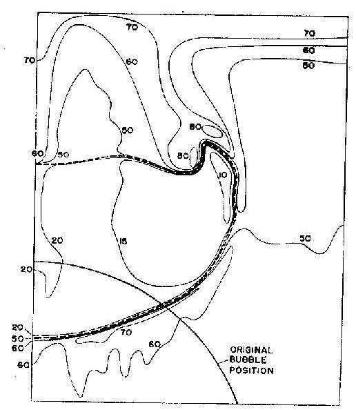 Another significant computer experiment is the calculation of the interaction of a shock or rarefaction with a bubble by Evans et al (70). The Particle in Cell method was used to compute bubble shapes and temperature distributions due to the interactions between shocks and rarefactions and helium bubbles in neon and neon bubbles in helium. The impetus for this study was in part provided by a desire to study the role of inhomogeneities in hot spot formation in explosives. Typical particle configurations obtained when a shock wave in neon hits a helium bubble are shown in Fig. 6, and a corresponding temperature profile is shown in Fig. 7. As mentioned above, the results of this experiment were used by Mader (69) in his investigation of hot spot initiation of explosives. Computer experiments similar to this one might also shed some light on the mechanism of droplet breakup, a problem of central importance in the formation and combustion of liquid sprays as well as in the propagation of detonations through fields of liquid fuel and oxidizer droplets. Amsden and Harlow(85) calculations of the instability and growth of disturbances at the slip interface between two viscous fluids moving with different velocities also bears some relation to the flame holder problem.